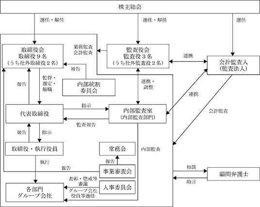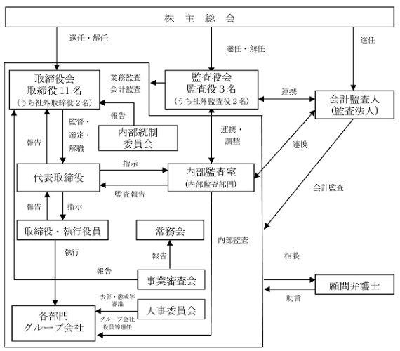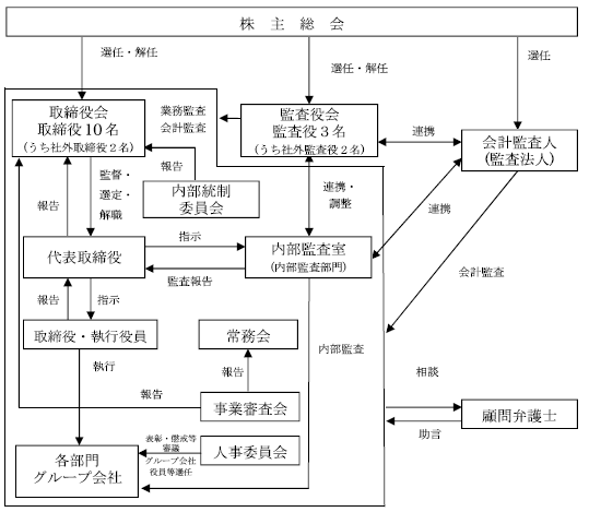 <取締役会>取締役会は10名(うち社外取締役2名)で構成されており、原則として月1回定例で取締役会を開催し、取締役10名の審議により審議事項を各取締役から説明し決議する体制をとっております。また、緊急の取締役会決議を要する重要事項については、都度臨時取締役会を招集し、個別審議により決議することとしております。