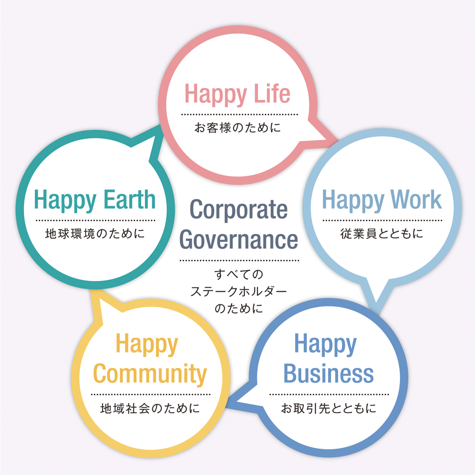 一方で社会・経済環境の変化とともに住宅業界の担う役割も進化し続けています。より一層社会から信頼され愛される企業づくりを目指して、社会的責任の国際規格ISO26000を参考に、CSR基本方針「5つのHAPPY」を定めました。