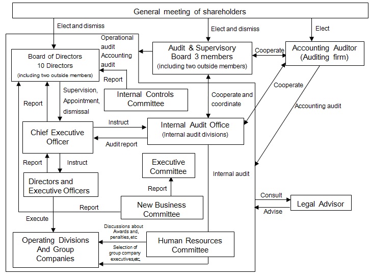 Board of DirectorsThe Board of Directors consists of 10 directors who meet regularly once a month, in principle. The Board of Directors makes decisions on matters discussed by the 10 directors, following briefings on each matter by the relevant director. Furthermore, the Board of Directors convenes extraordinary meetings as necessary to decide on urgent matters requiring a Board of Directors resolution, after each matter has been discussed individually.