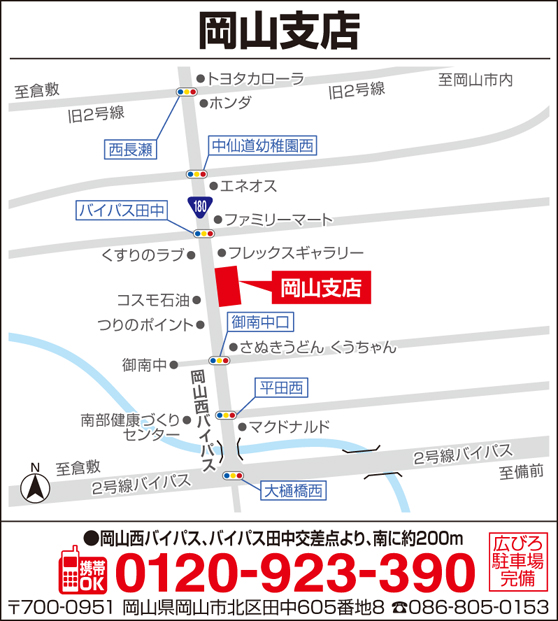 (岡山西バイパス、バイパス田中交差点より、南に約200m)