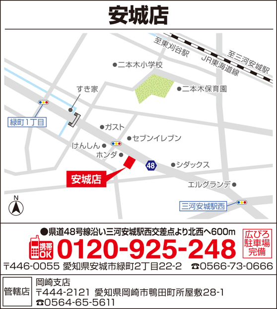 (県道48号線沿い三河安城駅西交差点より北西へ600m)