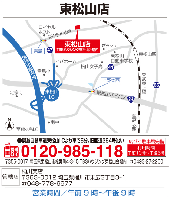 (関越自動車道 東松山 I.C より 車で 5分、旧国道254号沿い)