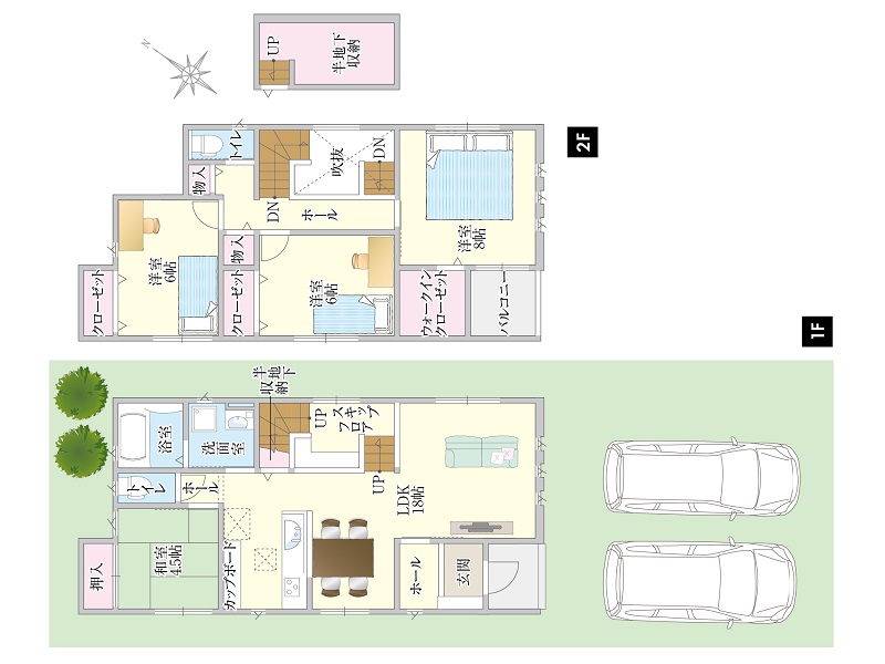 即引渡可能/駐車場2台以上可/浴室乾燥機/LDK15帖以上/対面式キッチン/カップボード二型/食洗器/ウォークインクローゼット/和室/全居室収納付き/トイレ2カ所/スキップフロア/半地下収納付き