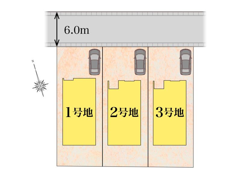 【区画図】全宅地、日当たり良好。外構工事付、駐車は3台可能。