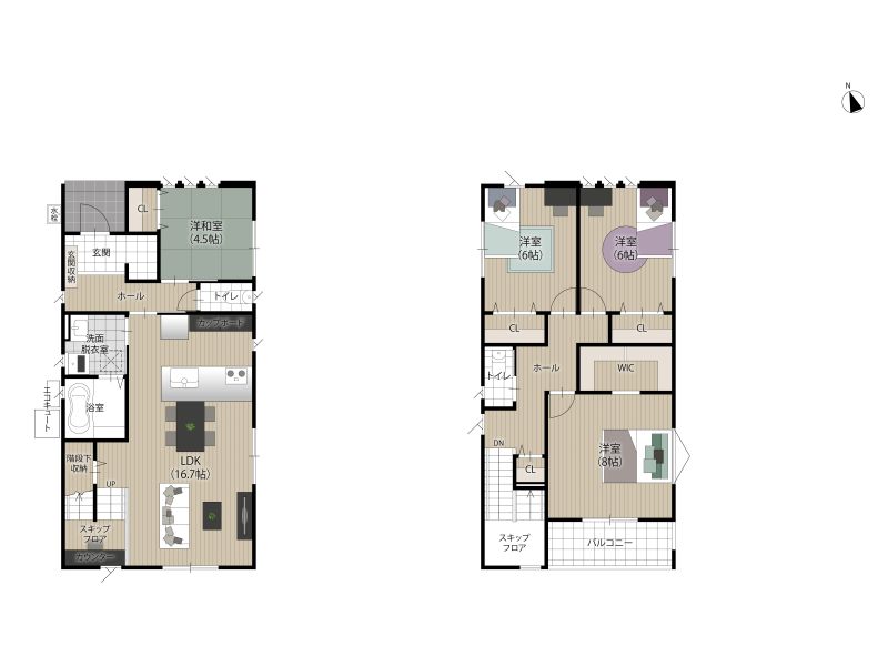 【2号地】LDK16.7帖。人気の「スキップフロア」、ペニンシュラキッチン、カップボードと食器洗浄乾燥機付。玄関には好評のシューズクロークを設置。