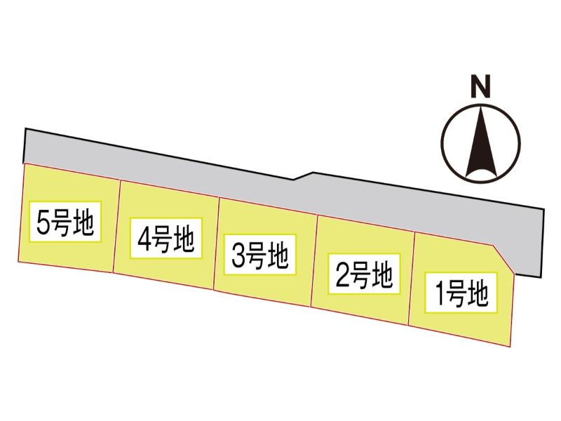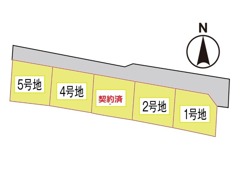 | 私道負担・道路 | 5号地有 36㎡持分1/3、1~4号地無・北側:幅員約5.0mの市道、北側:幅員約5.0mの私道 |