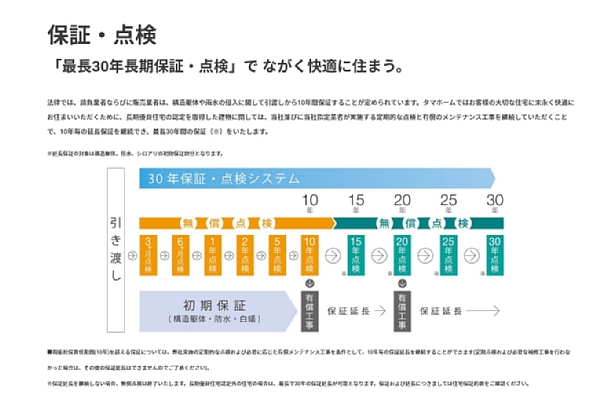 長期優良住宅の認定を取得した建物に関しては、当社並びに当社指定業者が実施する定期的な点検と有償のメンテナンス工事を継続していただくことで、10年毎の延長保証を継続でき、最長60年間の保証をいたします。