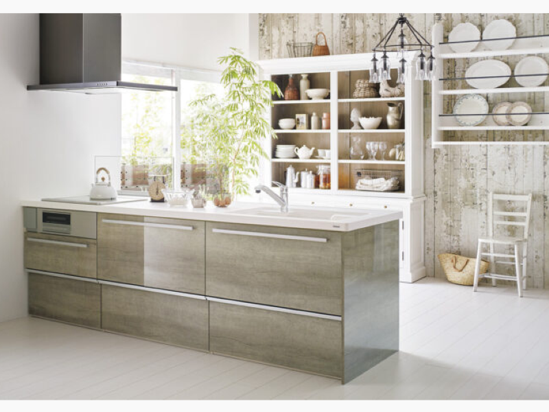 開放的なペニンシュラキッチンを採用。広いワークトップは人造大理石で傷も付きにくくお手入れが簡単です。カウンターで朝食や軽食も楽しめます。