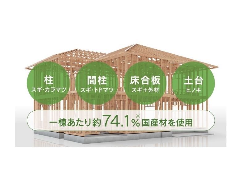 1棟あたり約74.1%国産材を使用し、土台にはヒノキ無垢材を採用。シロアリ対策にも効果的です。