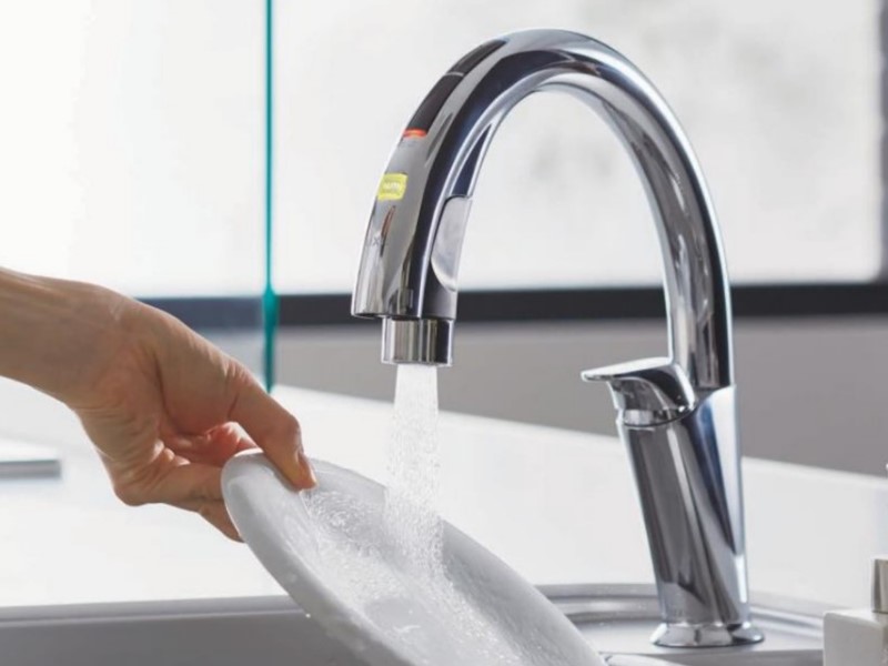 【キッチン】全ての棟に大人気のタッチレス水栓を採用。操作は吐水口先端のセンサーに手をかざすだけ。汚れた手でも触れずに楽々操作ができます(※イメージ)。
