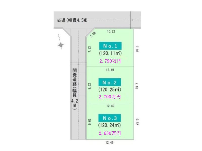 | 私道負担・道路 | 北側約4.5m公道・西側約4.2m開発道路 |