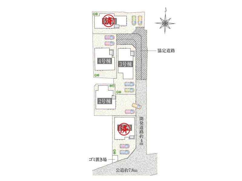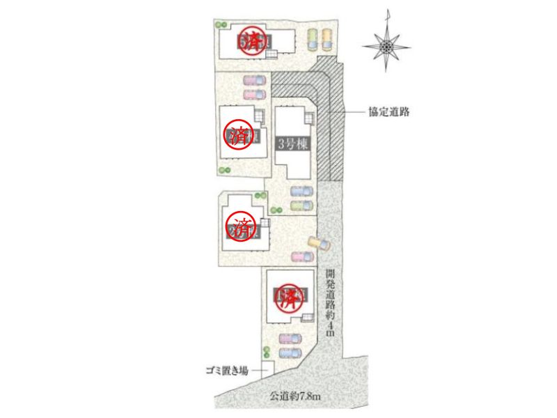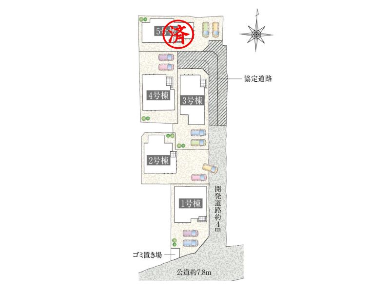 | 私道負担・道路 | 有(面積120.43㎡持分各1/5)・南側公道:約7.8m、東側私道:約4m |