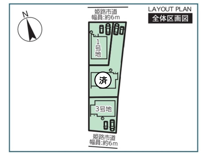 | 私道負担・道路 | 道路幅:6m、アスファルト舗装、公道、私道負担無し、2号地土地面積は路地状部分89.93㎡ |
