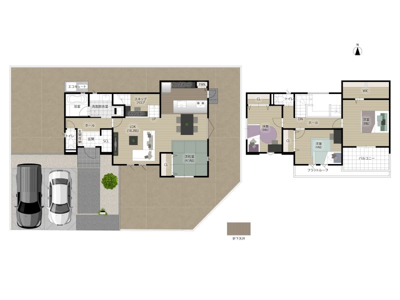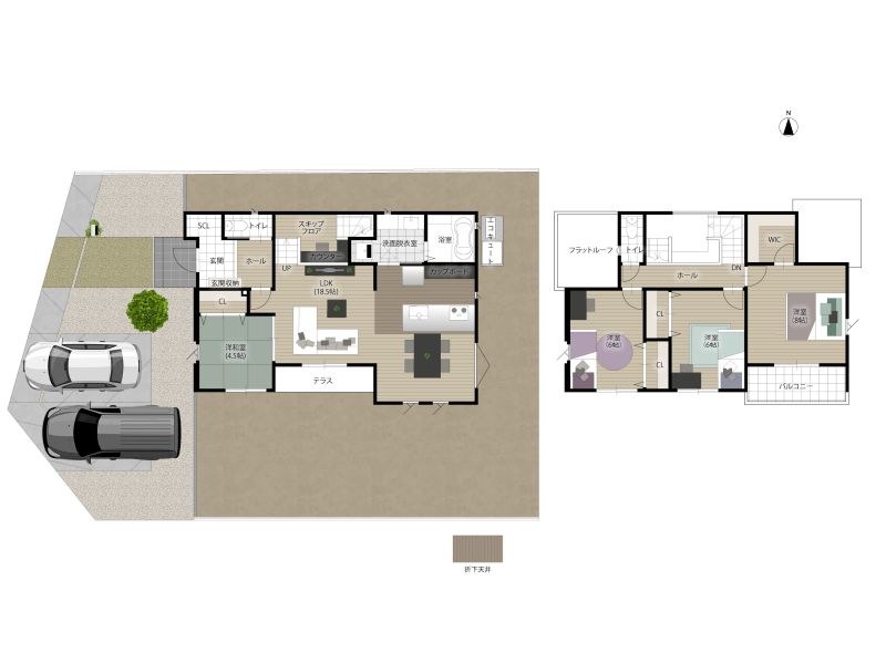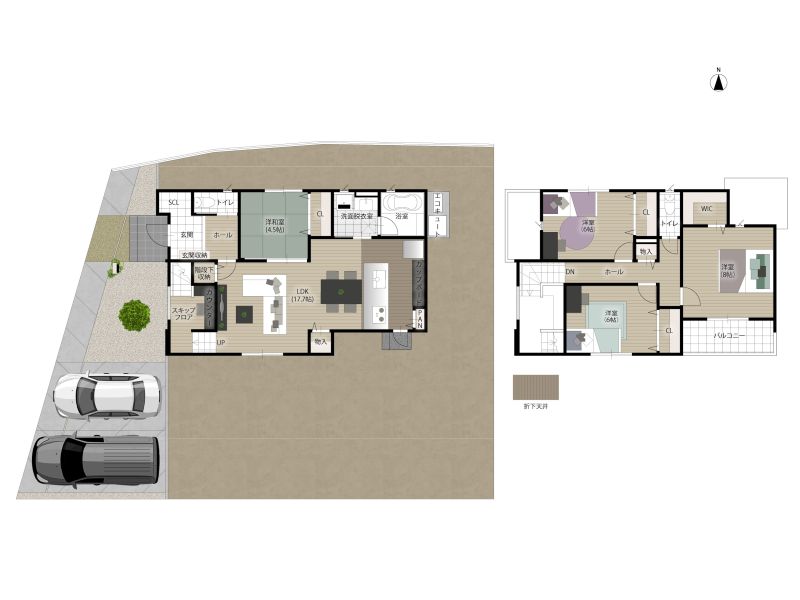 延床面積116.75㎡、4LDK、スキップフロア、ペニンシュラキッチン、ウォークインクローゼット、階段下収納、リビング階段