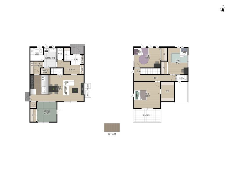 【4号地間取り図】LDKと洋室を合わせて20.5帖と開放的な広々空間を配置!数多くの収納スペースを配置しているため快適な生活ができます!