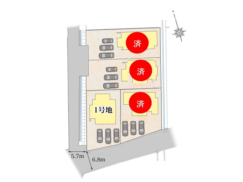 【全体区画図】全区画60坪超のゆとりのある敷地に、並列駐車2台以上可能なスペースを確保。前面道路は日当たりの良い南面に開放感のある幅員6.8m車のすれ違いや駐車もスムーズに行えます。