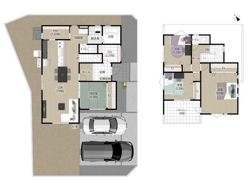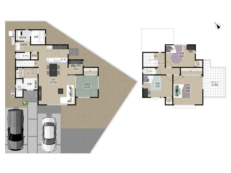 【2号地/子育て世帯に優しい家】 キッチンにウォークスルータイプの大型パントリーを完備♪外への勝手口を設けているため、重い物出し入れも楽々便利です。機能的な生活動線を確保しつつ、ゆとりのある生活空間の中、縦と横につながる家族とコミュニケーションが取りやすい間取りプランです。