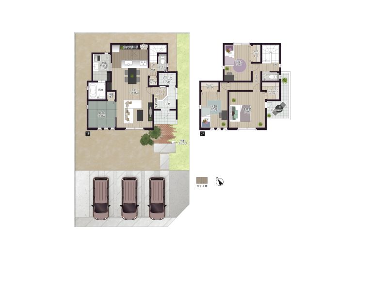 【2号地 間取り】お子様と一緒に脱ぎ履きしても余裕ある広さの玄関。窓を設置して採光性も確保♪シューズクロークは1.5帖の広さがあるので、外遊びの道具なども収納できます。