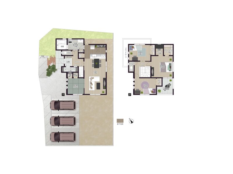 【3号地 間取り】お子様の遊ぶスペースや勉強をするスペ―スとして多目的に使えるスキップフロアつき!リビングに隣接しており、お子様を見守りながらくつろげます。