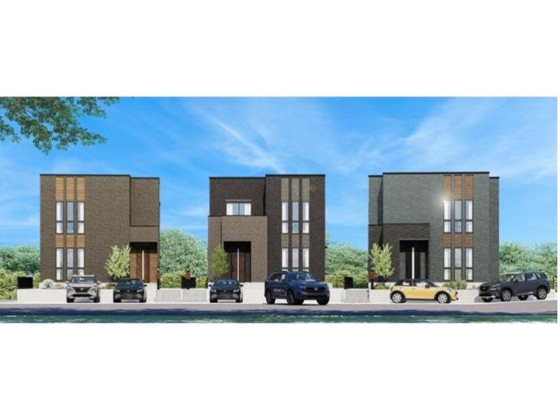 【5号地 外観完成予想】 デザイン性が高く、外観のポイントとなるルシアススクリーンが印象的です。前面道路は6.2mと十分な幅員がありますので、採光性・通風性ともに良好です。駐車場も3台分確保。