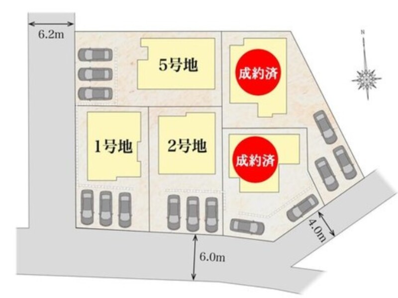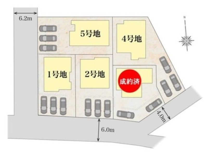 【全体区画図】全5棟南向き!前面道路もゆったりした広さなので、陽当りと通風良好です。駐車スペースは2~3台分確保しています。