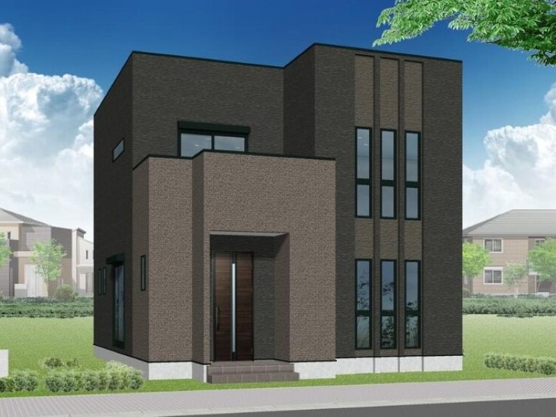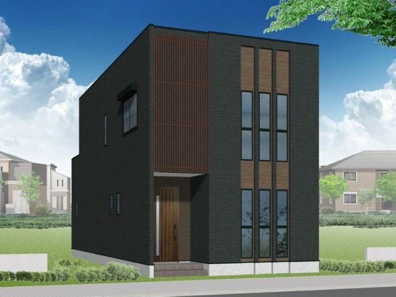 【2号地 外観完成予想】 シックなダークカラーを基調とした都会的な外観です。南面のバルコニーは5.5帖の広さがありますので、陽射しがたっぷり注ぎ込みます。お洗濯物もしっかり乾きます。