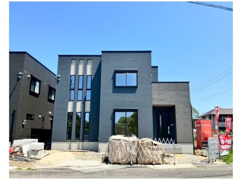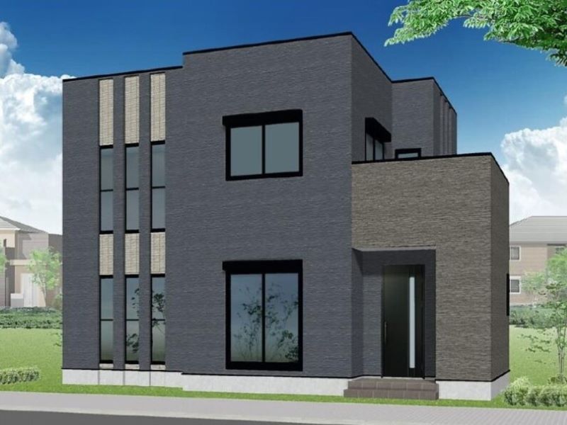 【2号地外観画像】落ち着いたブルーが目を引く都会的な外観です。2号地は人気の角地。前面道路も5.9m広めの幅員で安心です。6.0帖の広めのバルコニーからの日差しが差し込みます。