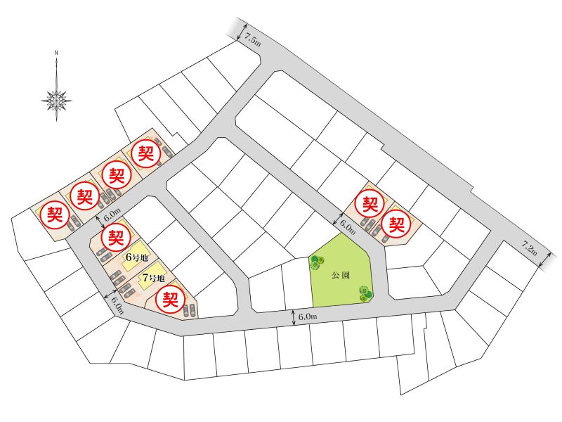 【全体区画図】全棟駐車スペースを並列で2台分確保。来客の際も安心です。前面道路は約6mと余裕があり、お車の出し入れもスムーズ!日当たりや間取りなど是非現地でご体感ください。