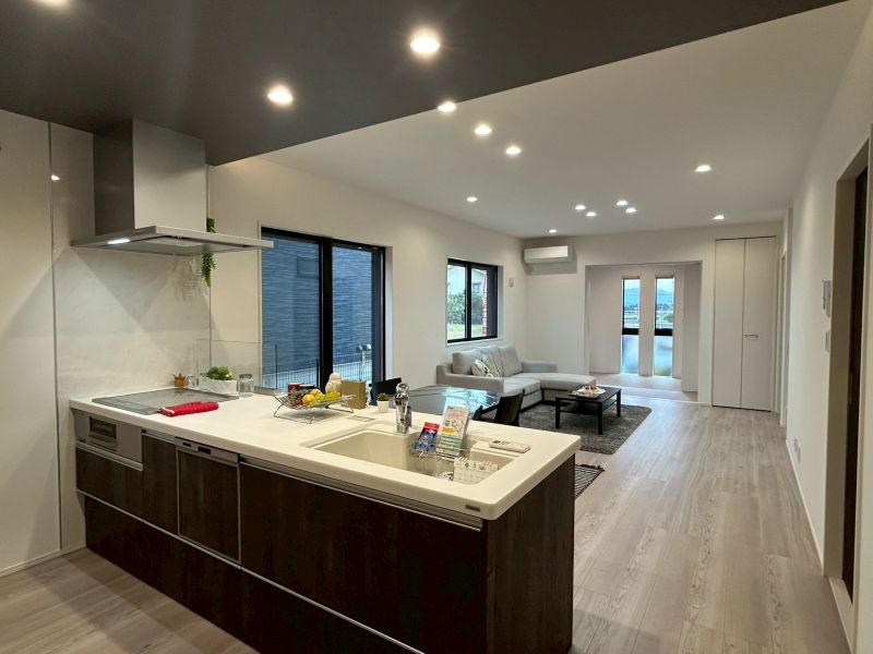 【6号地 キッチン】ペニンシュラキッチンは、食洗機を標準装備し毎日の家事をぐっと楽に。ダイニングとリビングは一体感があり、開放感のある住まいです!