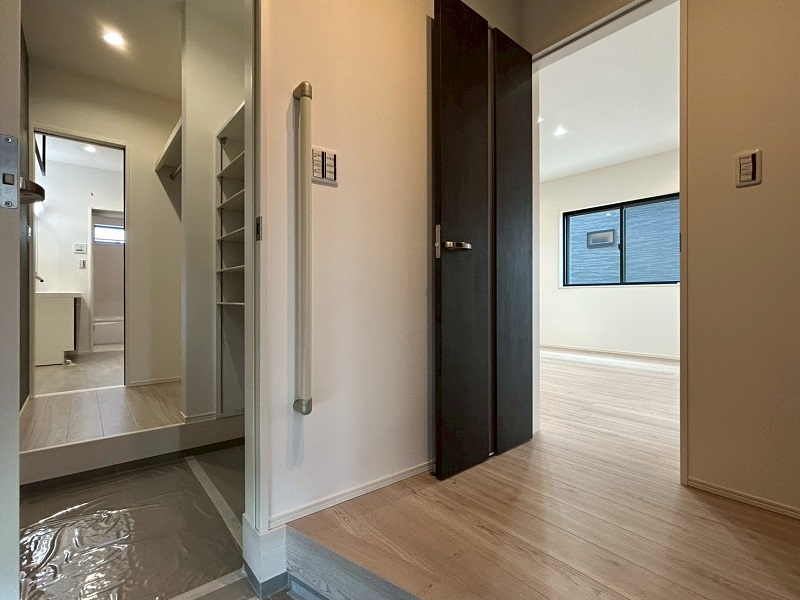 【6号地 回遊動線】玄関からシューズクロークを通って、クロークへと回遊できる動線。日々のお片付けもラクラクです。