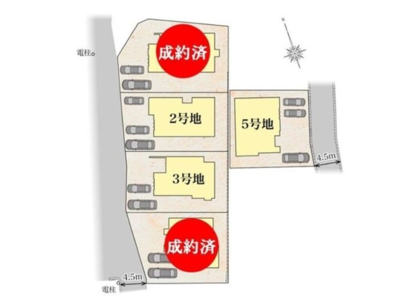 【全体区画図】全5区画の分譲地。約52坪以上のゆとりの敷地には、駐車2台以上のスペースを確保しています。