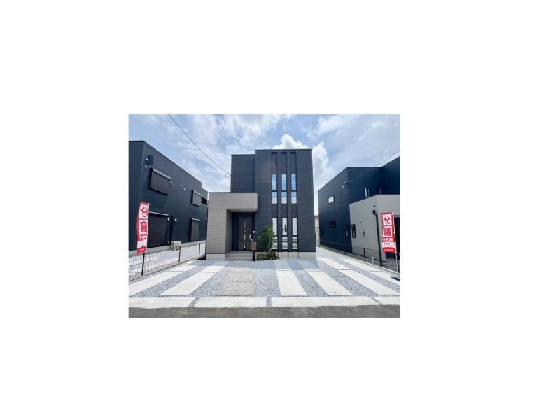 【2号地/現地外観】 タマホームのこだわりが詰まった意匠性のあるシンプルモダンなキューブタイプの外観です。広々とした敷地面積ですので、車3台分駐車可能となっています。※2025年10月撮影
