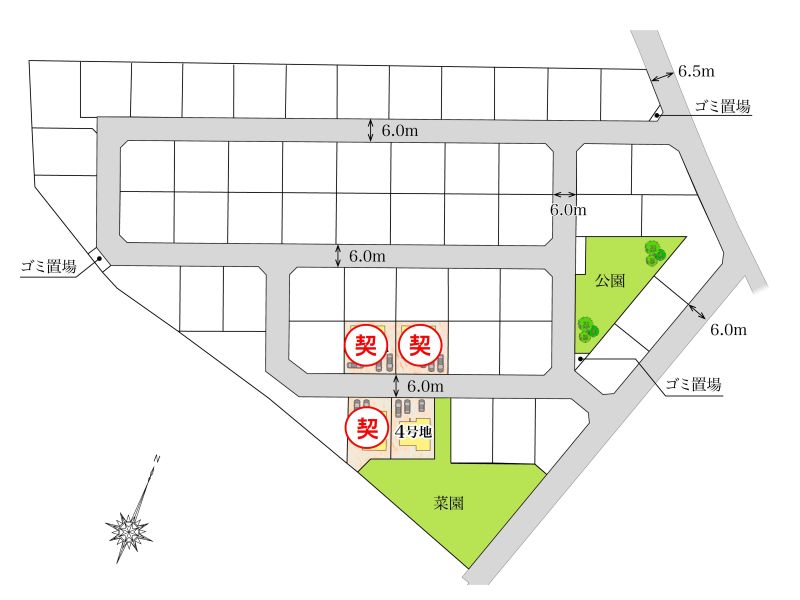 | 私道負担・道路 | 無し・道路幅:6m、アスファルト舗装、開発道路 |