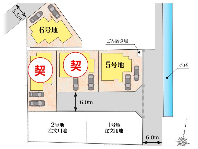 | 私道負担・道路 | 無し・道路幅:5.5m~6m、アスファルト舗装、開発道路 |