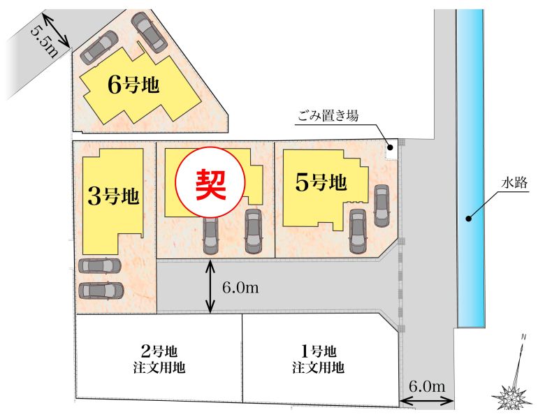 【全体区画図】全区画50坪超のゆとりのある敷地に、並列駐車2台可能なスペースを確保。幅員6mの開発道路に面し、車のすれ違いや駐車もスムーズに行えます。日当たり、通風良好な分譲地です。