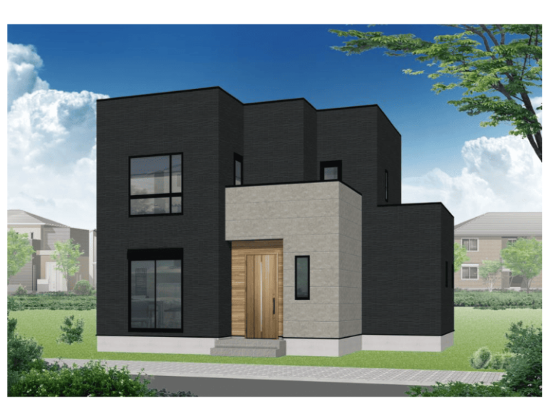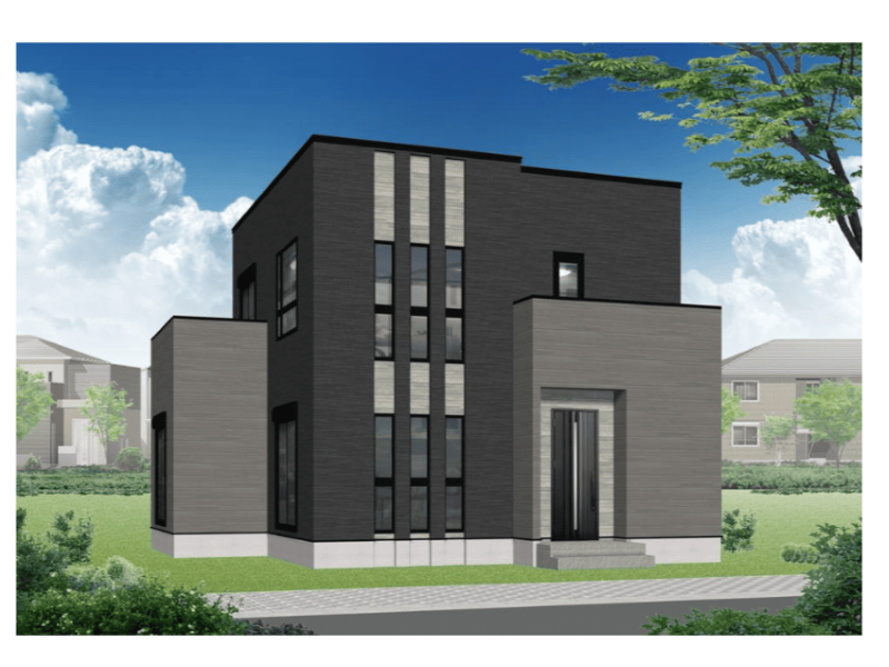 【1号地】 ブラックとグレーのツートンカラーがモダンな雰囲気です。角地ならではの陽当り・風通しの良さなど、開放感をご堪能いただけます。採光性とプライバシー性を両立する縦連窓を採用。