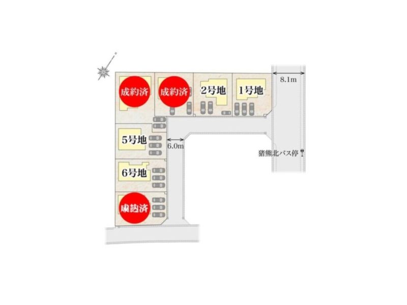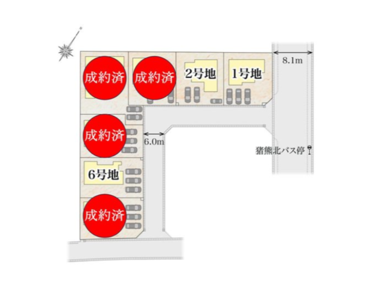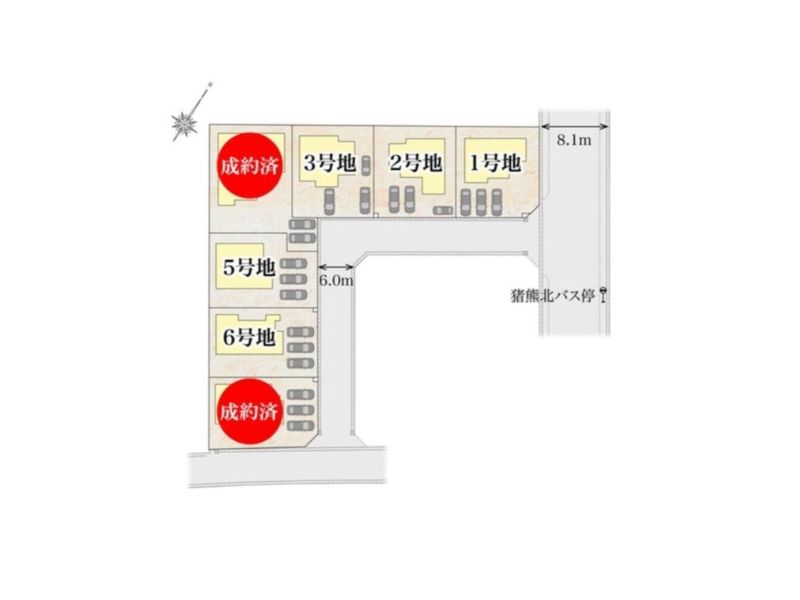 | 私道負担・道路 | 道路幅:6m、アスファルト舗装、南側/8.1m、アスファルト舗装、東側/※私道負担:あり(敷地内道路6.01m) |