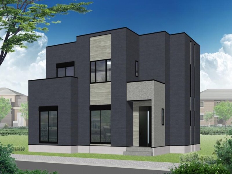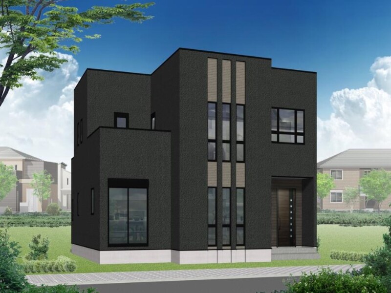 【1号地 完成イメージ】ダークカラーを基調にした落ち着いた印象の外観デザインです。角地なので、開放的な敷地の利用が可能です!角地ならではの日当たり、風通しの良さを現地でご体感ください。
