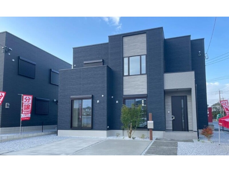 【1号地 完成写真】ダークカラーを基調にした落ち着いた印象の外観デザインです。角地なので、開放的な敷地の利用が可能です!角地ならではの日当たり、風通しの良さを現地でご体感ください。