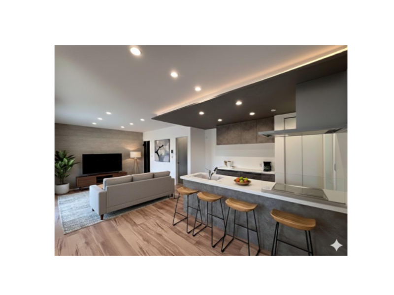 【2号地/内観完成予想図】ペニンシュラキッチンからは、家族の様子を見渡せます。折下げ天井のコーブ照明がおしゃれな雰囲気を演出。※掲載の家具・小物はCG加工したもので、販売価格には含まれておりません。