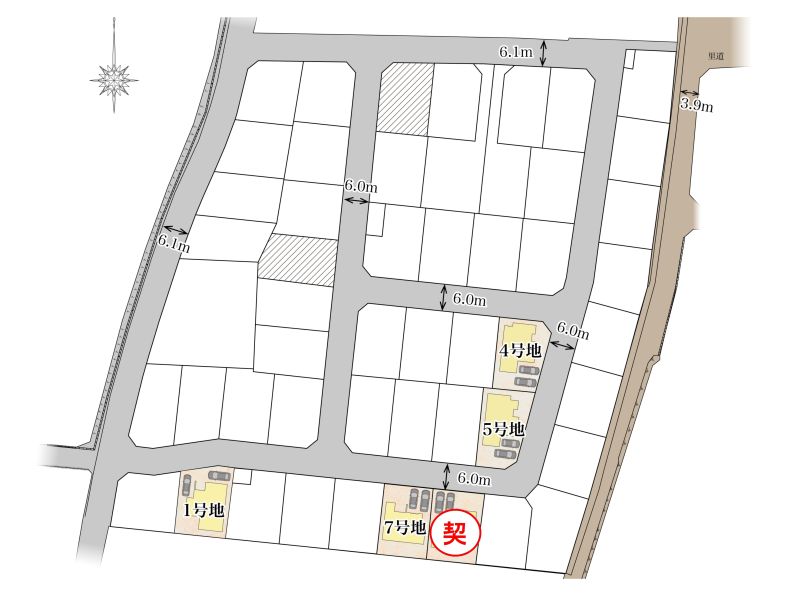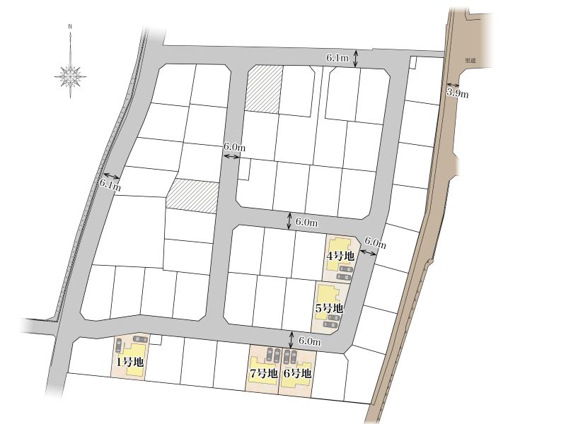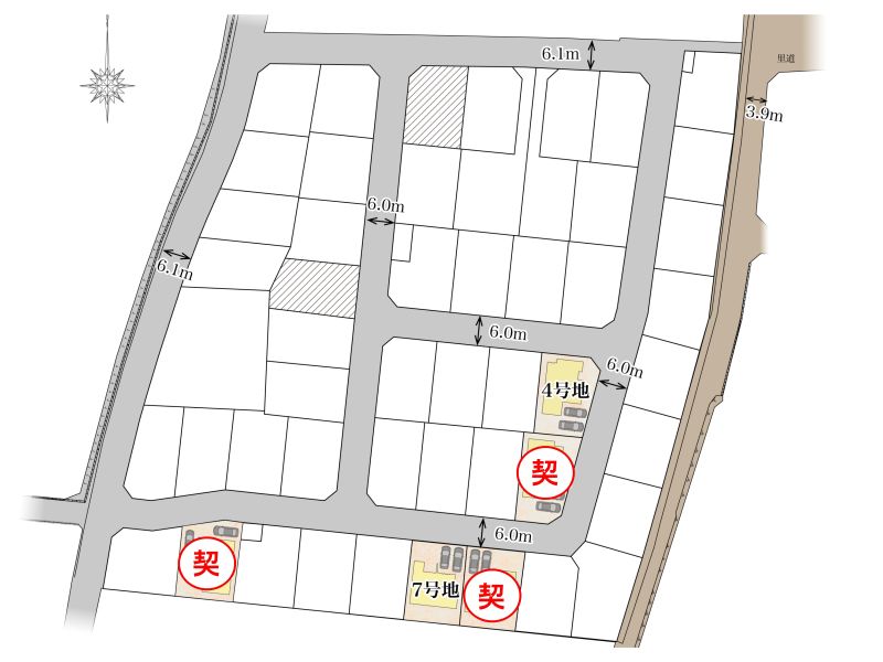 【全体区画図】大型分譲地内に全4棟の新築戸建分譲住宅が新登場!全棟52坪超のゆとりある敷地に並列で2台駐車可能なスペースを確保!前面道路は約6mと余裕があり、お車の出し入れもスムーズです。