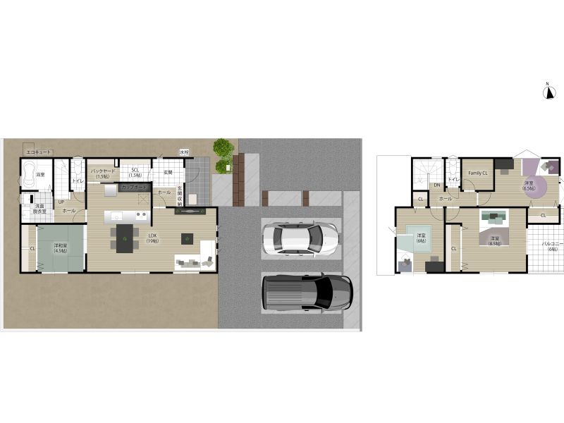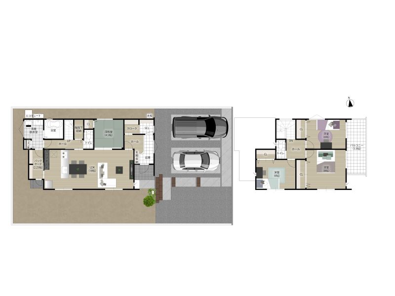 【2号地/回遊導線のある家】 玄関から2方向への導線を確保し、LDKへとつながる2way玄関を採用。玄関・SCL・バックヤードを一直線に配置した収納力と利便性に優れたプランニングです。心地の良い6.0帖のワイドバルコニーを完備した開放感溢れる邸宅です♪