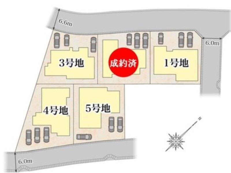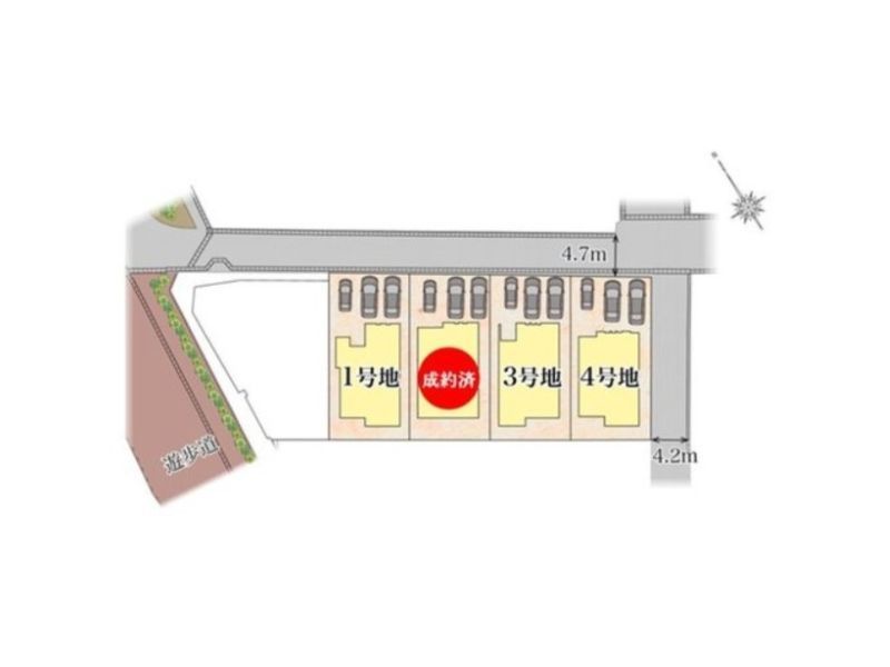 全区画に駐車スペースを3台分確保しました!複数台車を所有するご家族や来客時に便利です。川に沿った遊歩道横の立地なので風通しと陽当たり良好です!