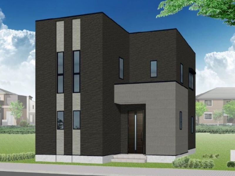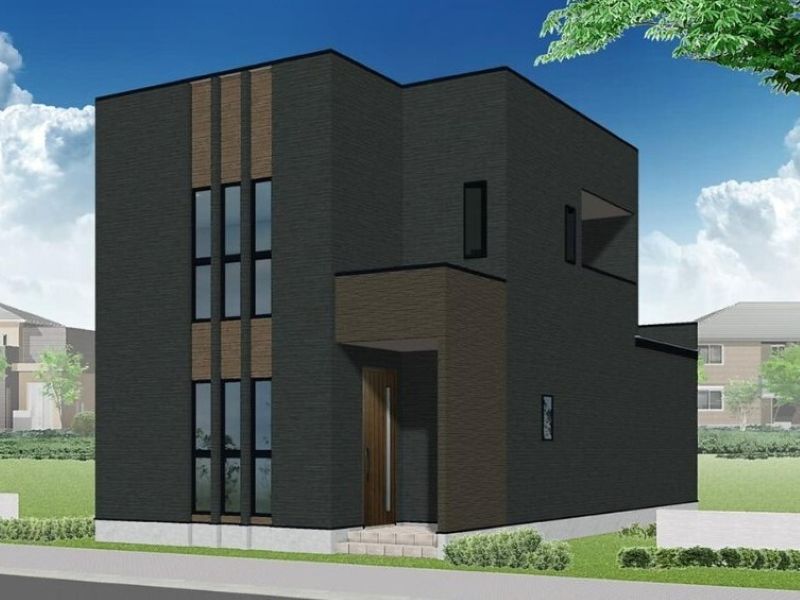 【1号地】ブラックを基調とし、モノトーンにまとめられたシックな外観が都会的です。玄関を入ると収納豊富なシューズクロークとクロークがあり、お出掛けの動線が短縮できます。