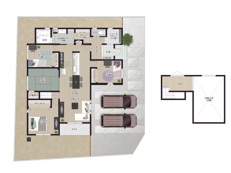 【1号地 間取り】LDKに隣接する6.0帖の和室はキッチンからも目が届きやすく来客時にも便利。お子様の遊びスペースにも使えるロフトのある家。