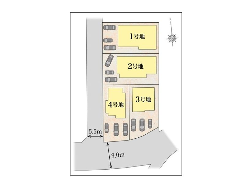 【区画図】好立地に全区画駐車スペース3台以上可能。開放的でのびのび暮らせる戸建分譲住宅になります。