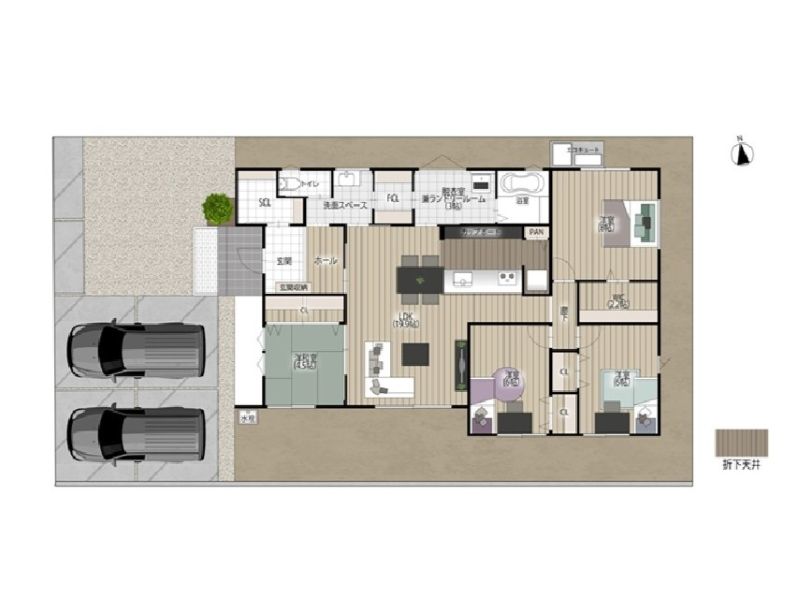 【2号地 間取り】家事動線の良い平屋の4LDK。脱衣所兼ランドリールームに隣接したファミリークローゼットもございます。寝室と子供部屋も離れていてプライベートもしっかり保てます。