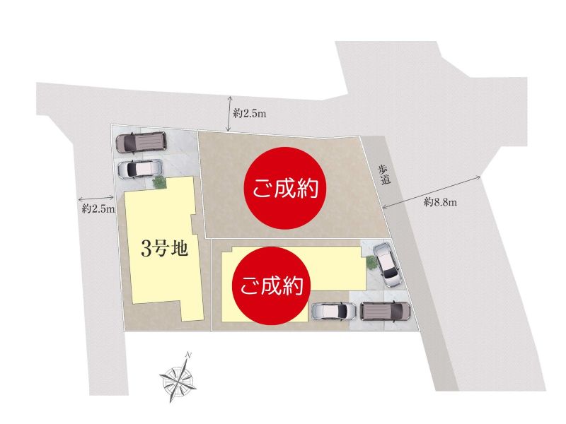 | 私道負担・道路 | 私道負担:無 ・ 北 幅員2.5m 西 幅員2.5m |