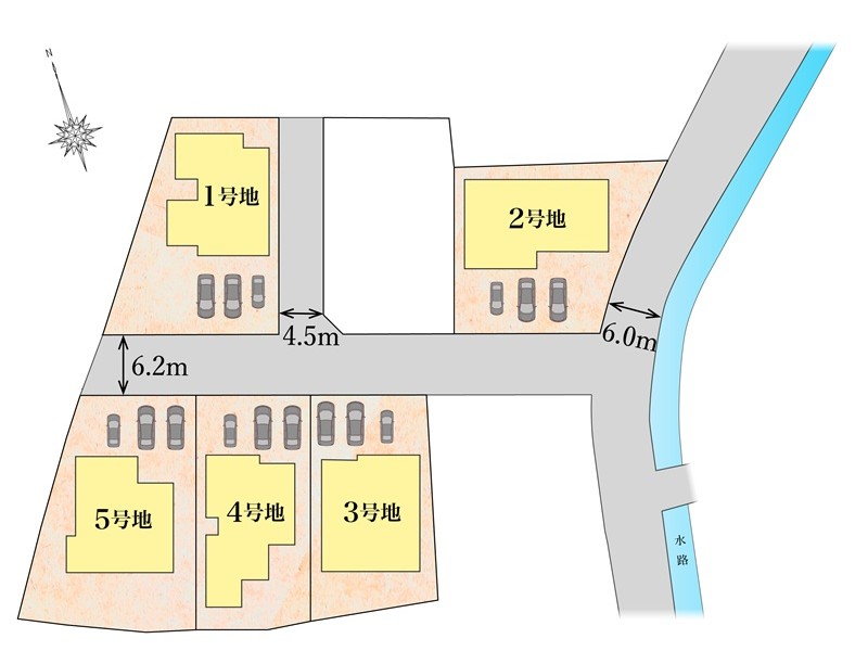 【区画図】全区画駐車スペース3台以上可能。全棟日当たり良好♪開放的でのびのび暮らせる分譲地になります。