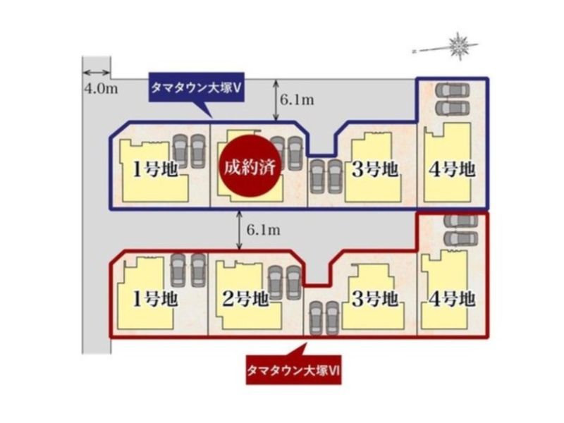【区画図】前面道路は分譲地内にお住まいの方のみが通るので、プライバシー面でも安心です♪前面道路が6.0m以上確保しているので、陽当り・通風もしっかり確保!